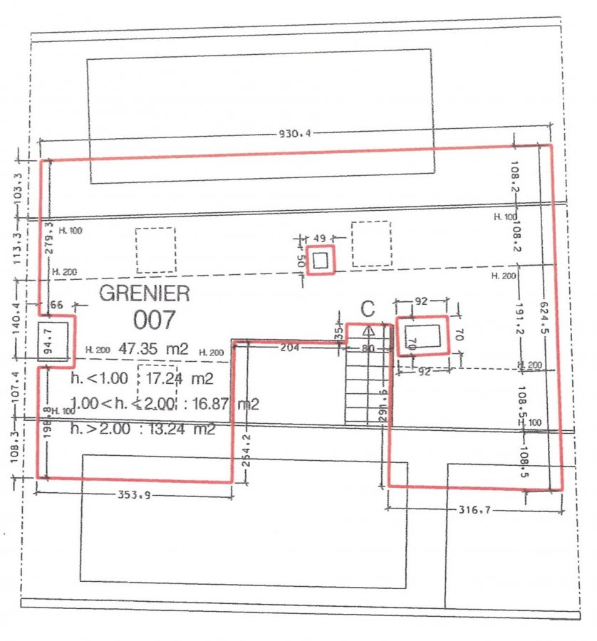 - Mezzanine de 47.35 m² avec 13.2 m² utilisables plus de 2 m² et au sol 34 m² en dessous de 2 m