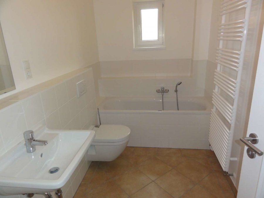 - Salle de bains avec baignoire, lavabo et WC suspendu